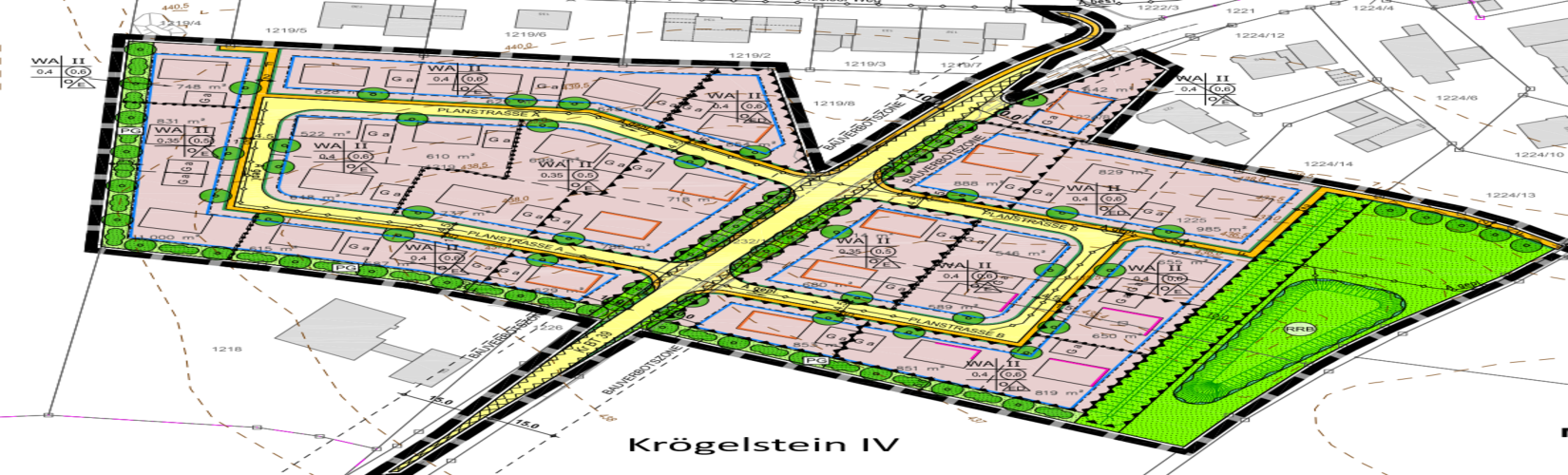 96142 Hollfeld – Krögelstein Die Grundstücke liegen am slüdlichen Ortsrand des Ortsteiles Schnackenwöhr. Sie werden durch die Kreisstraße BT 39 in zwei Teilbereiche mit insgesamt 29 Bauplätzen geteilt (Exposé).